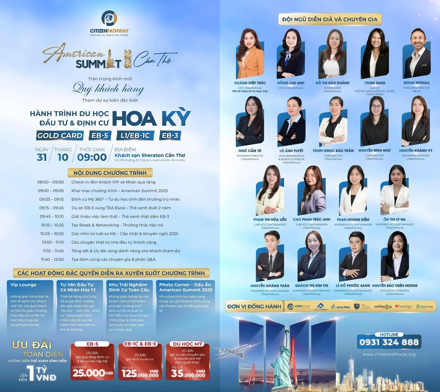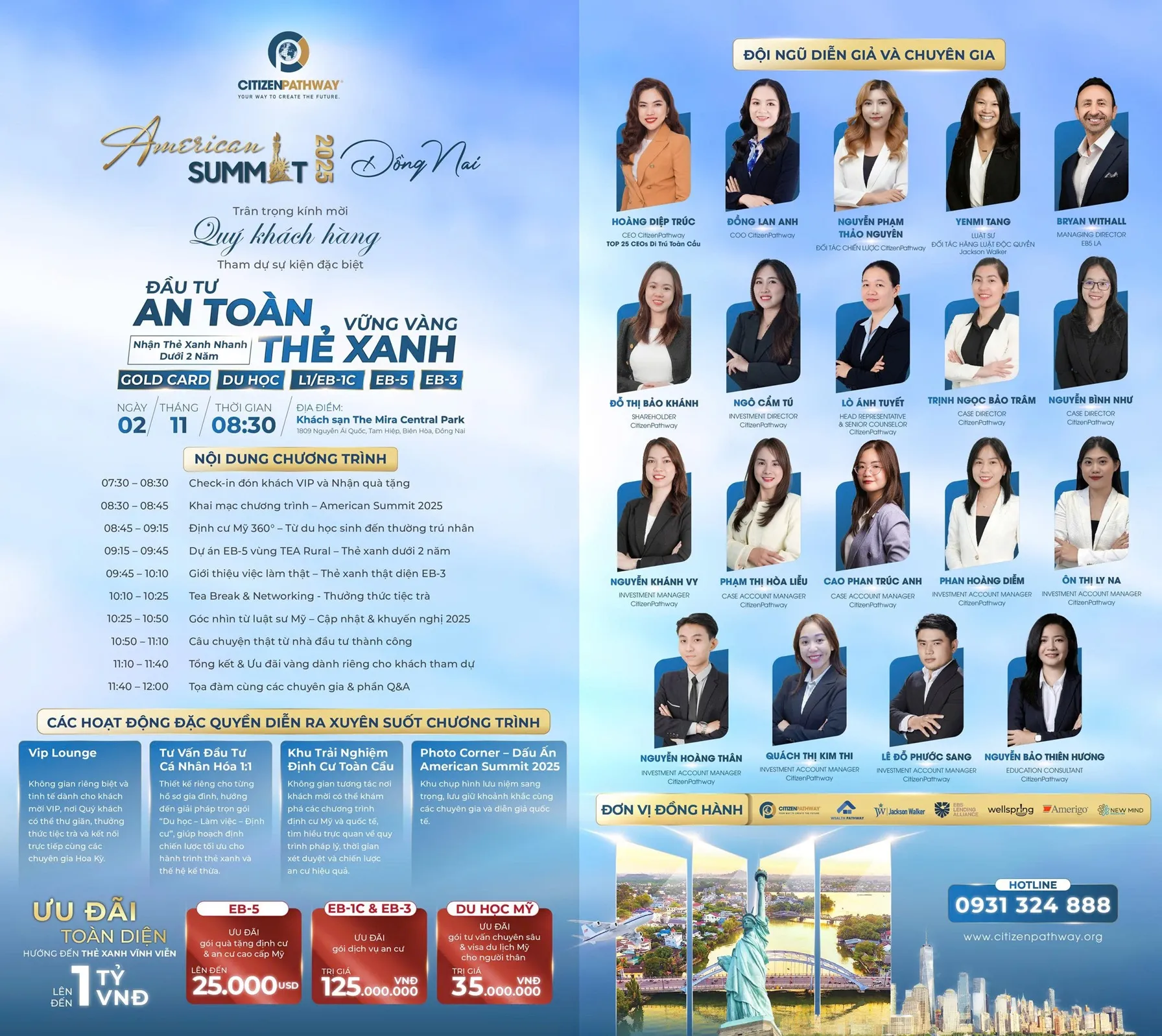 Citizen Pathway trân trọng giới thiệu AMERICAN SUMMIT 2025 – sự kiện chuyên sâu và quy mô nhất trong năm, nơi quy tụ các chuyên gia di trú hàng đầu Hoa Kỳ, luật sư danh tiếng quốc tế cùng những dự án EB-5 được thẩm định toàn diện và bảo chứng bởi Citizen Pathway. Đây không chỉ là hội thảo – mà là hành trình mở lối cho tương lai, nơi mỗi cá nhân, mỗi gia đình có thể định hình con đường an cư, học tập và đầu tư vững vàng tại Hoa Kỳ.